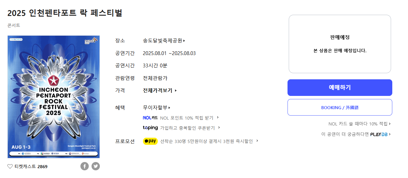 인천펜타포트락페스티벌티켓팅의 주요 정보를 한눈에 확인하세요.